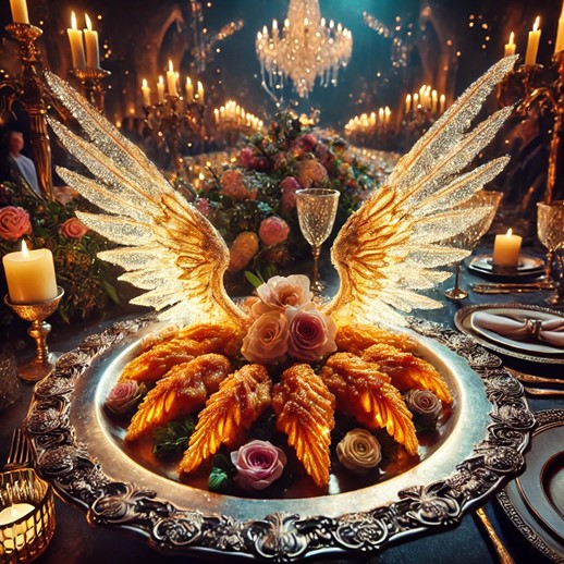 Serving: Luminescent Wings Delight is served as a centerpiece in grand feasts and enchanting celebrations. The dish is presented in an exquisite manner, often with other enchanted delicacies and floral decorations that accentuate its radiant glow.