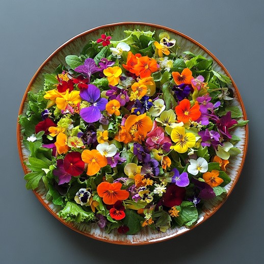 - Scatter the colorful edible flowers over the greens, adding a visually striking element to the salad.