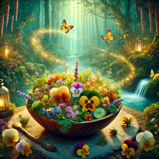 Asavar gathered the gifts, not knowing their meaning but feeling the song of their essence. Returning to the village, Asavar prepared the first salad: greens kissed by the Flutterfly’s nectar, flowers imbued with its light, and a dressing born of its gift to the pool. When the villagers tasted it, their souls were lifted, and they saw colors in the world once more.
