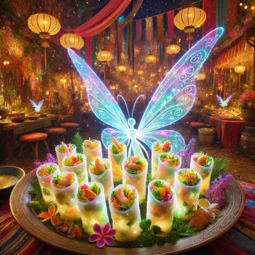 Alvaris returned to the kingdom, carrying the essence of the garden within his heart. He combined the bounty of the land—crisp vegetables, fragrant herbs, and tender shrimp—with the ethereal glow of the beetles’ wings, crafting delicate rolls that shimmered like captured dawn. The Radiant Rice Paper Rolls became a dish of celebration, shared during Lumina’s festivals and offered in reverence to the interconnectedness of all things.