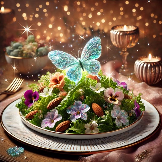 Guided by this belief, the farmer gathered the soft glow left behind by the Flutterbugs, careful not to disturb their flight. They returned home and blended this celestial dust with the bounty of the fields—fresh greens, flowers blooming with vibrant colors, and almonds roasted with care. The result was a salad that shimmered like a fragment of the night sky, a dish that captured the beauty of the stars and the life of the earth.