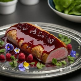 Notes: A decadent and celebratory dish. The rich berry glaze complements the lean and flavorful Skystrider meat.
