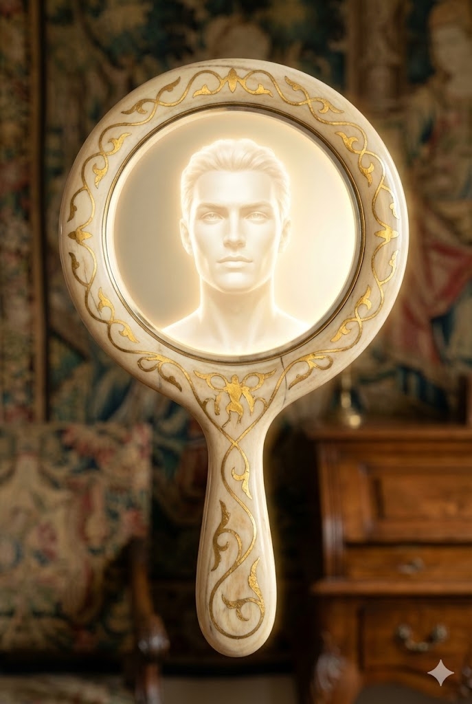 - User’s Perspective: When looking into the glass, the reflection is never dull or dirty. Even in pitch darkness, the user sees their face illuminated by a soft, flattering “stage light” that doesn’t exist in the real world. When “Face of the Legend” activates, the user sees their features morph—a jawline sharpens, eyes brighten, scars fade or rearrange into “noble” battle wounds. It is like looking at a painting of oneself rather than a reflection.