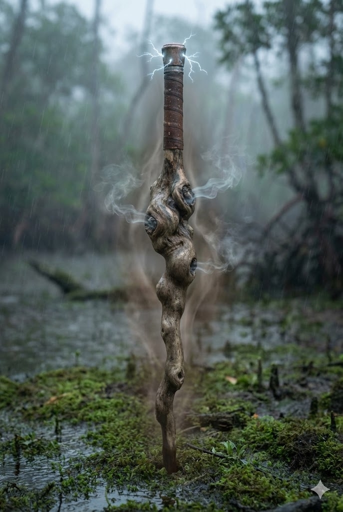 - User’s Perspective: When the magic is active, the wood of the stick seems to swell slightly, the “Gout-Root” knots pulsing like inflamed veins. The copper cap tarnishes and cleans itself in seconds, cycling through the colors of a bruising storm (green, purple, gray). The user notices the air around them looking “thicker,” like the humidity haze before a downpour.