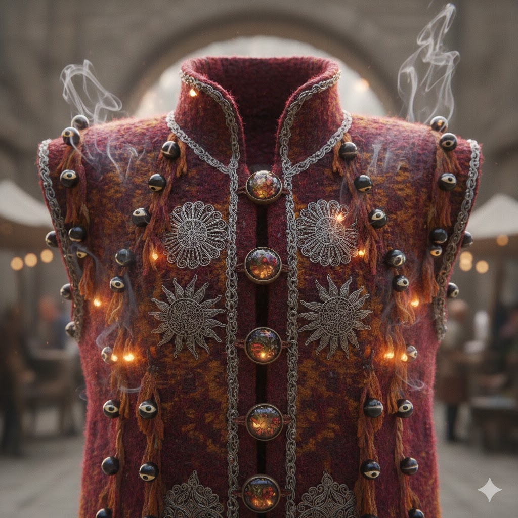 4. Setting the Talismans Use the etching stylus to carve a single “Eye” rune into each obsidian bead. Sew these beads at regular intervals along the fringes and seams. These act as the “Gaze Reflected” reactive nodes, grounding negative energy before it reaches the wearer’s torso.