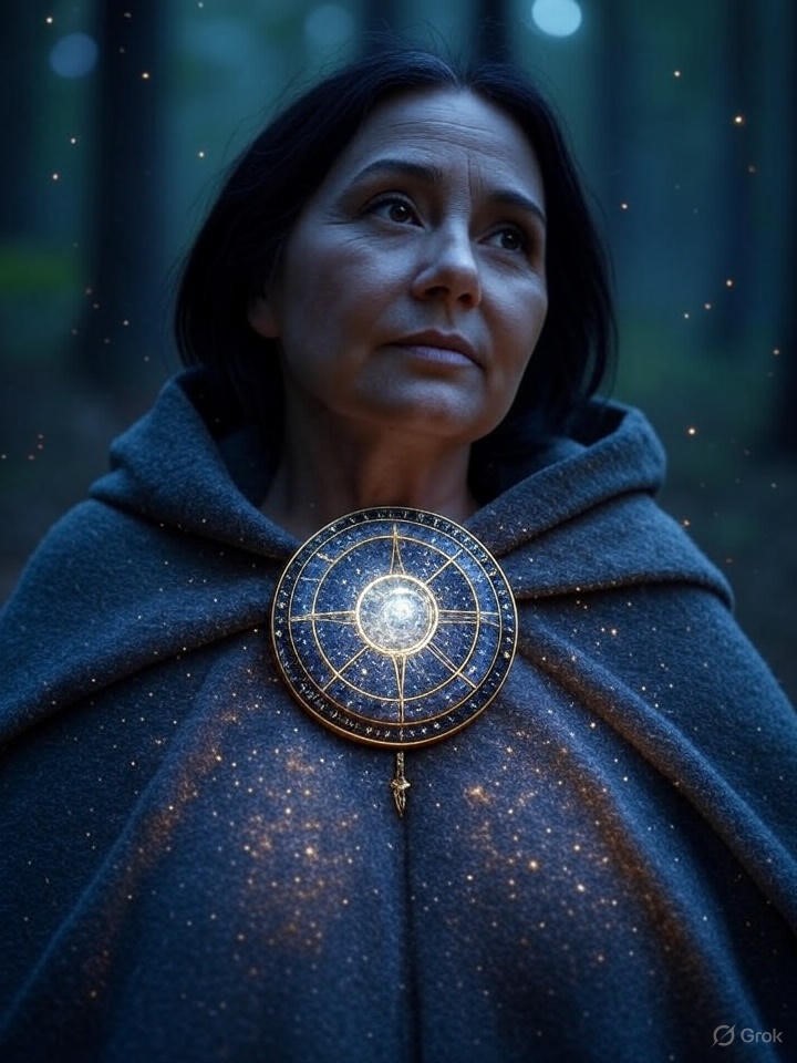 User’s Perspective (Sight): Upon activating the Astrology and Divination 12 of Acceptance by invoking “As the stars decree,” the user perceives a radiant shimmer emanating from the brooch, its gold frame glowing with a soft amber hue reminiscent of a Middle Eastern desert sunset, while the 108 blue gem beads pulse with a celestial rhythm, each emitting tiny sparkles that mimic the alignment of Saṃsāra’s stars. The central turquoise medallion seems to ripple with etched zodiac symbols, projecting faint holographic patterns of planetary orbits that dance across the wearer’s vision, offering glimpses of foretold paths through jungle vines or ocean waves, as if the gear channels ancient Mesopotamian star maps into the present moment.