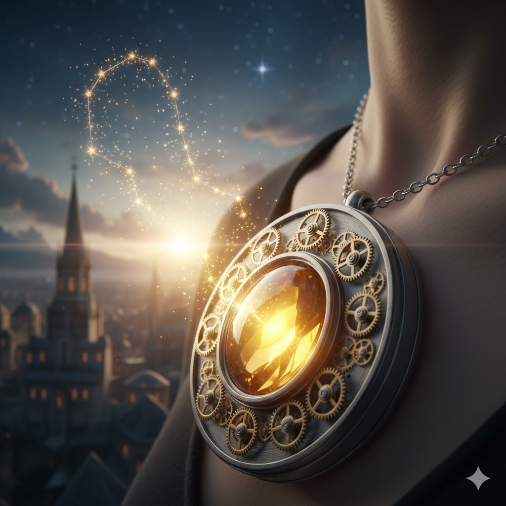 Appearance: The item is a polished nickel locket, circular and flat, worn on a fine silver chain. The front face is an intricate clockwork map of the current night sky, with moving electrum gears that click softly as the planets shift. In the center is a small, convex lens of “Amber-Flow” crystal. When the wearer gazes through this lens at someone they truly admire, the crystal glows with a warm, golden luminescence, and the internal gears spin with joyous velocity.