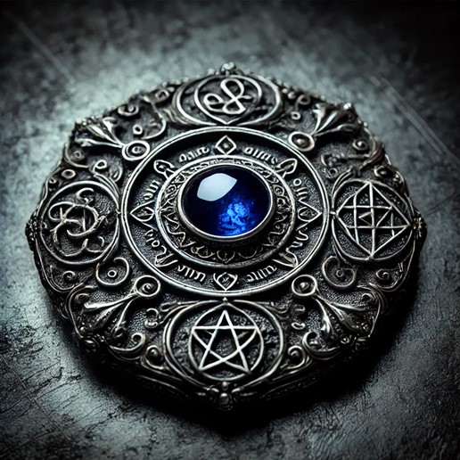 - Description: A blackened metal amulet with a sapphire gemstone.