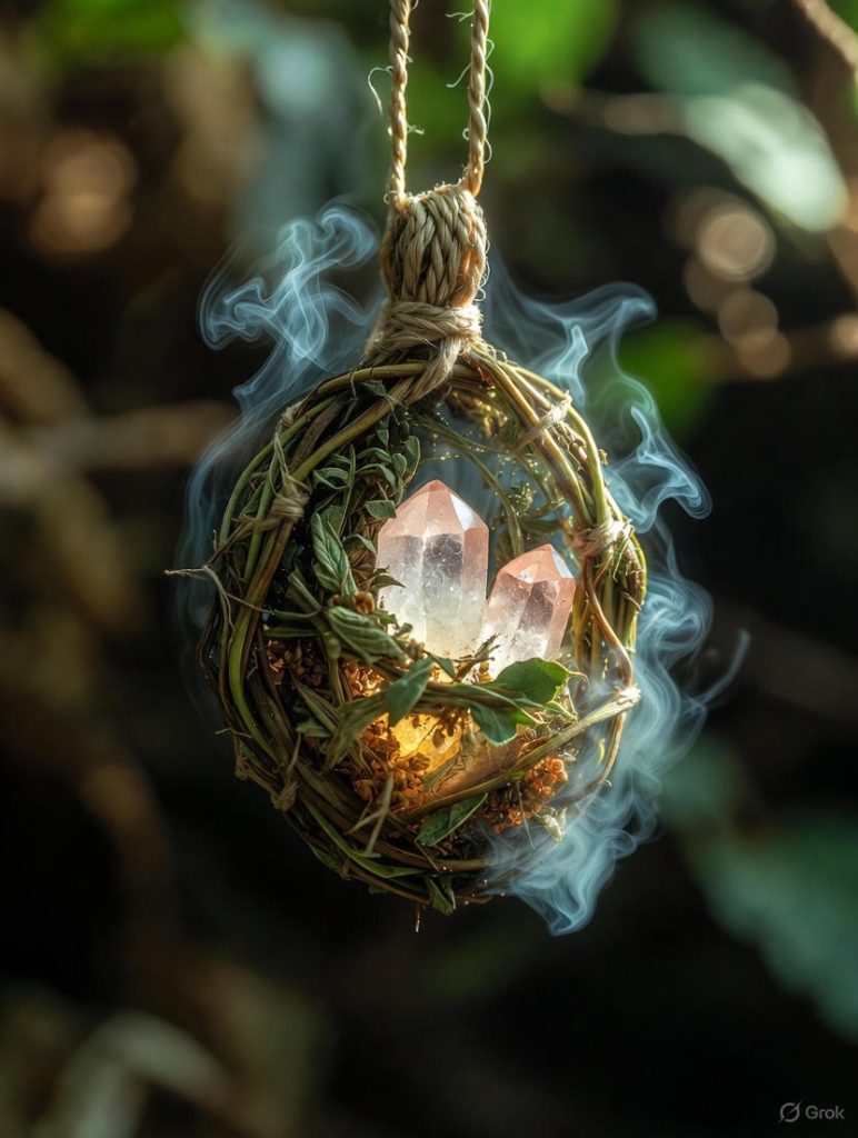 This pendant of vines, quartz crystals, and dried herbs subtly disrupts vital energies.