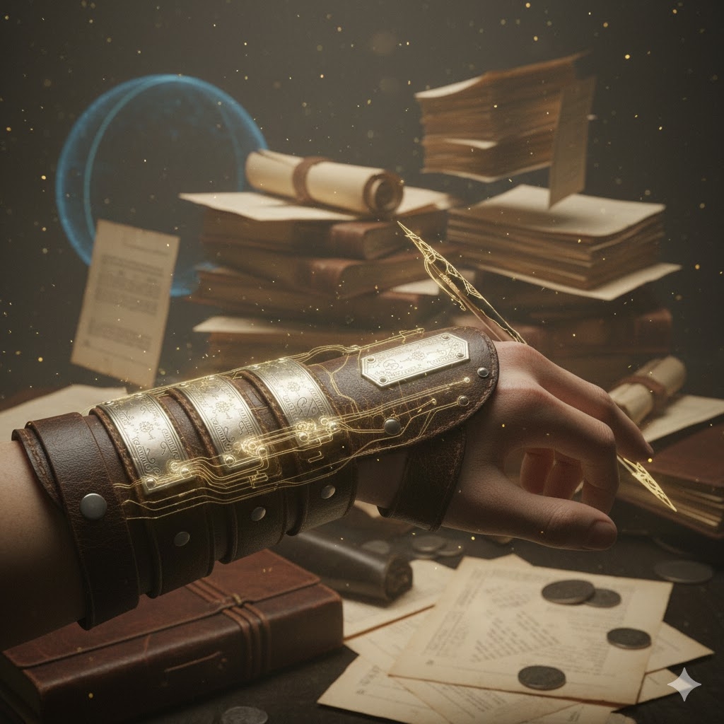 - Symbol of Order: The grip is a visual marker of an individual who has transitioned from a mundane laborer to a “System-Shaper.” It symbolizes the power of the record over the power of the sword.