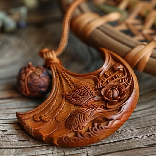 The Daoist Agronomist’s Boon is a beautifully crafted wooden amulet, adorned with intricate carvings that reflect the harmony between nature and humanity. Here’s a detailed description of its appearance:
