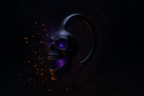 • Sight — The jester-skull glints with shifting violet sparks; a swirl of ember-orange confetti seems to spiral outward before vanishing.
