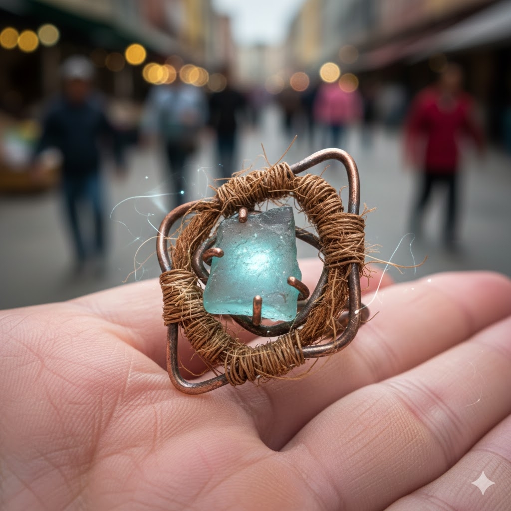 - Form: An uneven copper wire ring with a jagged sea-glass shard that catches on fabric.