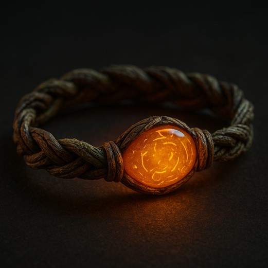 A flexible wristband braided from strands of moonlit treebark and lichen-thread, faintly glowing with amber light where the material knots into a central ovoid gem. The gem appears ever-shifting, its hues rotating through molten gold, sun-cracked orange, and pale fire-opal depending on the willpower of the wearer. Small etched patterns form and dissolve within the gem, like fleeting script glimpsed in a dream, never repeating the same twice. When worn, the band faintly hums when choices are made that defy expectation. The inner texture is soft to the touch but becomes resistant when external pressure attempts to twist or guide the wearer’s actions.