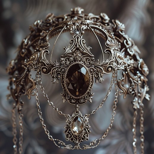 The Somnolent Sandman takes the form of an ornate headpiece, intricately crafted from a blend of tarnished silver and smoky quartz. Delicate filigree patterns reminiscent of swirling dream clouds adorn the surface, with hints of ethereal mist seeming to swirl within the quartz crystals.