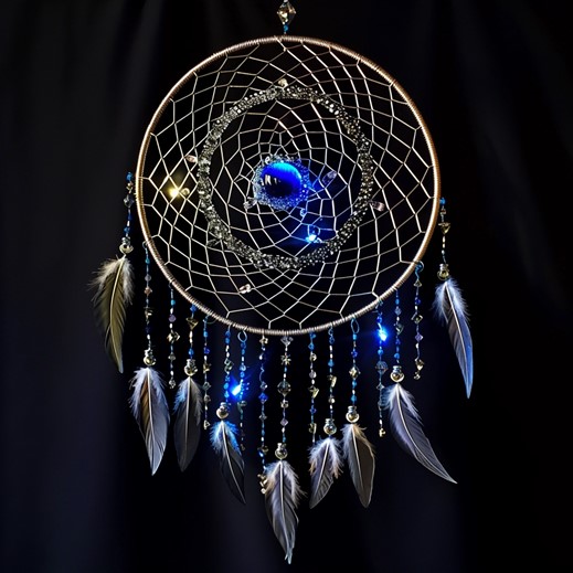 At the center of the dreamcatcher, there is a large, deep blue sapphire, which represents the endless depths of the dream world. The sapphire is surrounded by a ring of small feathers, each one a different color, representing the diversity of dreams that the Dream Magic 42 can capture and manipulate.