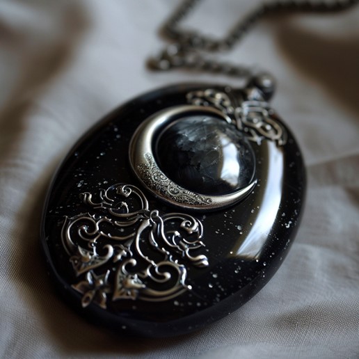 At the center of the amulet, there is an inset moonstone, oval in shape and polished to a smooth, almost glass-like finish. The moonstone shimmers with a soft, ethereal light that seems to shift and change colors as it catches the light, reminiscent of the ever-changing landscape of dreams. The stone is surrounded by intricate silver inlays that form the image of a crescent moon, cradling the moonstone like a celestial guardian.