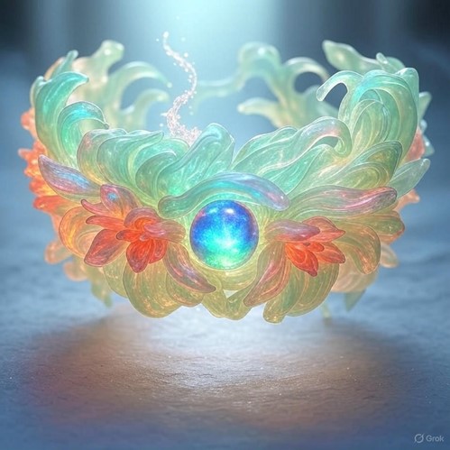 Description: The Elemental 19 of the Graceful Bloom is a slender jade anklet, its surface intricately carved with flowing patterns of fire, water, earth, and air, resembling blooming petals. A water-kissed quartz gem dangles at its center, radiating a soft, iridescent glow that shifts through elemental hues—red, blue, green, and white. When activated, it releases elegant elemental tendrils or sparkles, often prompting the wearer to move with graceful pride. Its beautiful design mirrors the wearer’s poise, making it a refined tool in Saṃsāra’s high-magic realm.