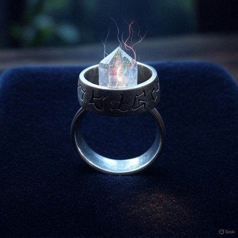 - Description: A tarnished silver ring with elemental etchings and a glowing quartz crystal, a magical oddity for a baffled runner in a high-tech world adapted to Saṃsāra’s magic.