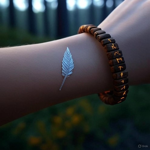 - Description: A mystical wristband of driftwood and enchanted silk, featuring a glowing griffon feather shard with administrative runes, enhancing adaptability for runners in Saṃsāra’s magical governance.