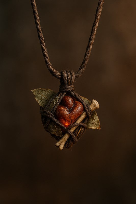 Description: A small bundle worn over the chest, fastened by a thin strap of woven bark-fiber and seed-thread. At its center is a heartroot fragment—reddish-brown, knot-shaped, and lightly resinous—bound with a twist of dried honeyleaf and two tiny bones (bird and mouse). When worn, the charm rests gently over the sternum, growing subtly warm in the presence of suffering, imbalance, or chronic strain. In firelight, the heartroot gleams as if moist. A faint, bittersweet scent clings to the wearer: crushed mint, bark salve, and dried rose petal.