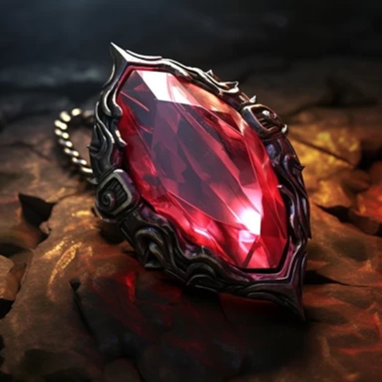 Item Description: This item appears as a crimson-hued gem, rough around the edges as if freshly plucked from the earth, set in a simple iron setting to be worn as an amulet. The coloration within the gem appears to swirl when viewed from different angles, creating an unsettling effect.