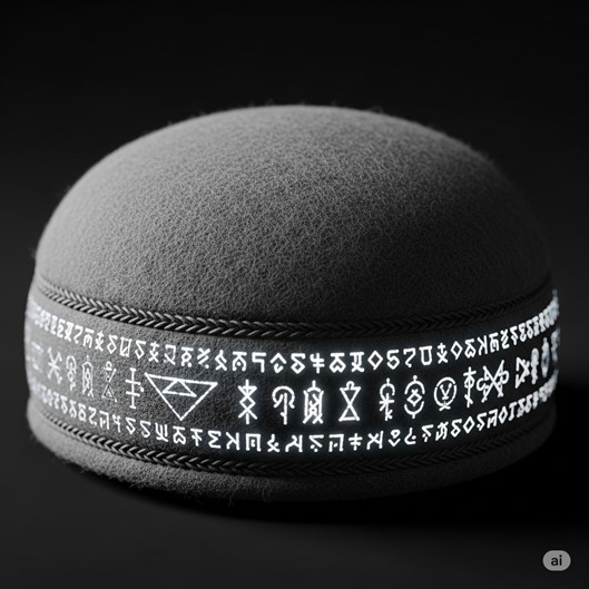 Description A simple, well-made skullcap of a circular, brimless design, crafted from tightly woven, undyed grey wool. It appears unassuming at first glance. Its only decoration is a band of intricate embroidery along the edge, stitched in a thread of a slightly darker grey. Upon close inspection, this embroidery is not a geometric pattern but a continuous, spiraling line of incredibly tiny, esoteric script that seems to shift and blur if stared at for too long. The cap is soft and comfortable, feeling slightly cool to the touch.
