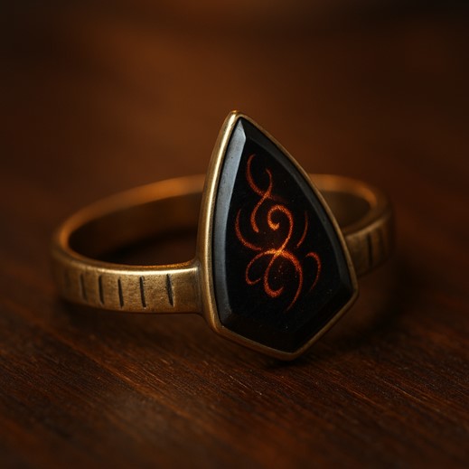 Description: A slender brass ring marked with index-line engravings. Its embedded obsidian shard is etched with looping calligraphic forms visible only in candlelight. The ring warms near written languages, flares briefly when lies are spoken in its presence, and faintly vibrates when important information is at risk of being forgotten.