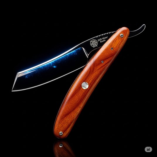 Description The Still-Water Razor is an exquisite example of a folding straight razor. The blade itself is not metal, but a sliver of polished black obsidian, volcanic glass sharpened to a supernatural edge. The blade seems to drink the light, and when tilted, its surface has a liquid shimmer, like the perfectly still water of a deep pool at midnight. The handle, or scales, is crafted from a warm, reddish-brown Koa wood, polished to a high gloss and inlaid with a single, small piece of mother-of-pearl. The razor is perfectly balanced, feeling light but substantial in the hand. When opened, it makes a soft, whisper-quiet shink sound, and emanates a faint, clean scent, like fresh water and shaved wood.