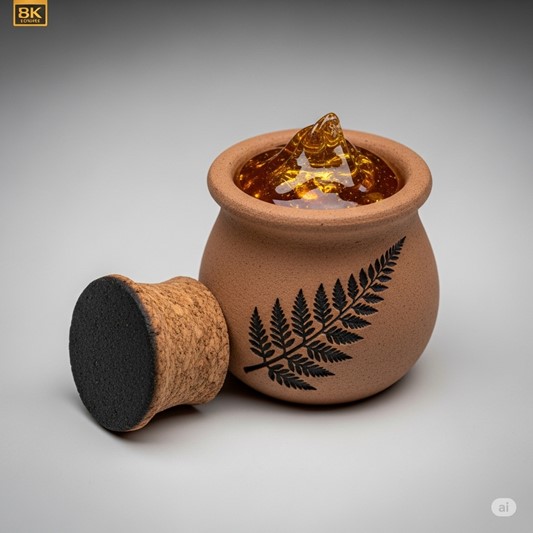 Description This item is a small, unglazed ceramic pot, roughly the size of a clenched fist, with a dark cork stopper sealing it. The earthenware is a simple, earthy brown, cool to the touch, with the stylized image of a single fern leaf etched into its side. Inside, the pot contains a thick, viscous, amber-colored resin. The substance is translucent and seems to capture the light, shimmering with a faint, internal golden luminescence. It emits a strong, pleasant aroma of pine sap, warm beeswax, and a subtle undertone of campfire smoke. Though it is sticky to the touch, it cleans away easily with a bit of water, leaving no residue. The pot always seems to be about three-quarters full, no matter how much has been used recently.