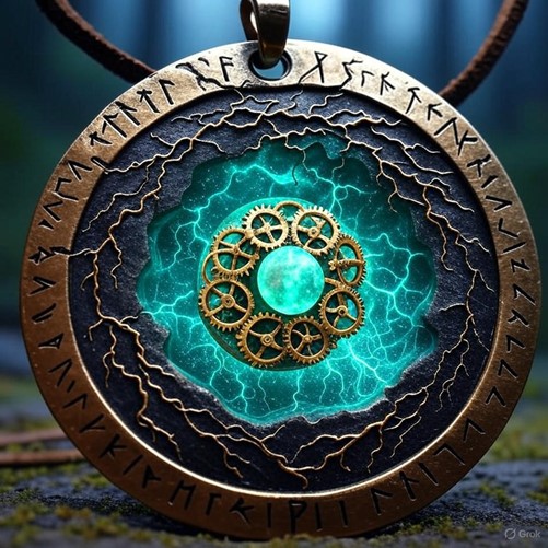 - Description: A weathered bronze pendant etched with wave and lightning runes, centered on a faintly glowing turquoise gem encircled by spinning gears, worn on a leather cord. It empowers Saṃsāra brawlers with storm magic in narrative-driven conflicts.