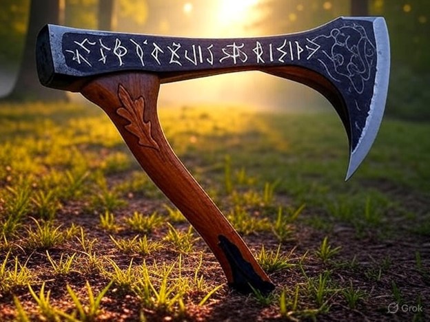 • Description: A rich earthy brown ironwood axe with shimmering silver runes, an obsidian edge, qi-infused crystal embed, and an oak leaf carving, tailored for Pathfinder choppers in a high-magic world.