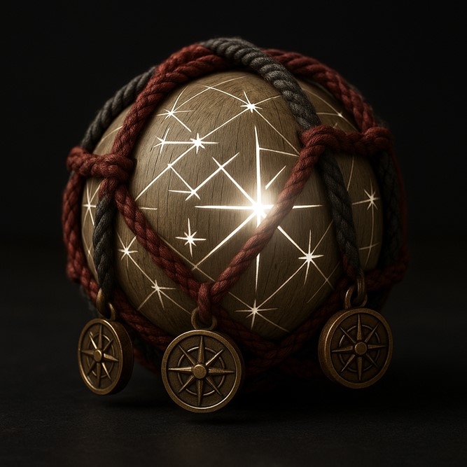 A driftwood sphere wrapped in crimson and slate cords, etched with angular constellations and adorned with bronze medallions. When activated, emits a resonant bell tone and a steady white glow.
