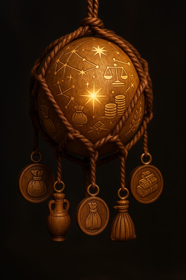 Description: A palm-sized sphere of soft golden driftwood, etched with star maps intertwined with swirling symbols of coins, scales, and bales. It is suspended in a lattice of coppery cords, each thread strung with polished wooden tokens carved in the likeness of trade goods—grain sacks, amphorae, bolts of silk. When activated, it emits a mellow, rhythmic chime like clinking coins in a counting room.