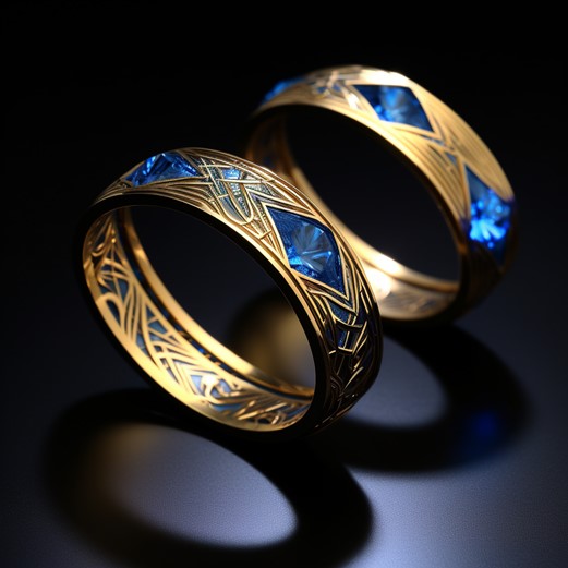 - Description: The wristbands are visually striking, capturing attention with their intricate etchings and the embedded sapphire that emanates a subtle glow.