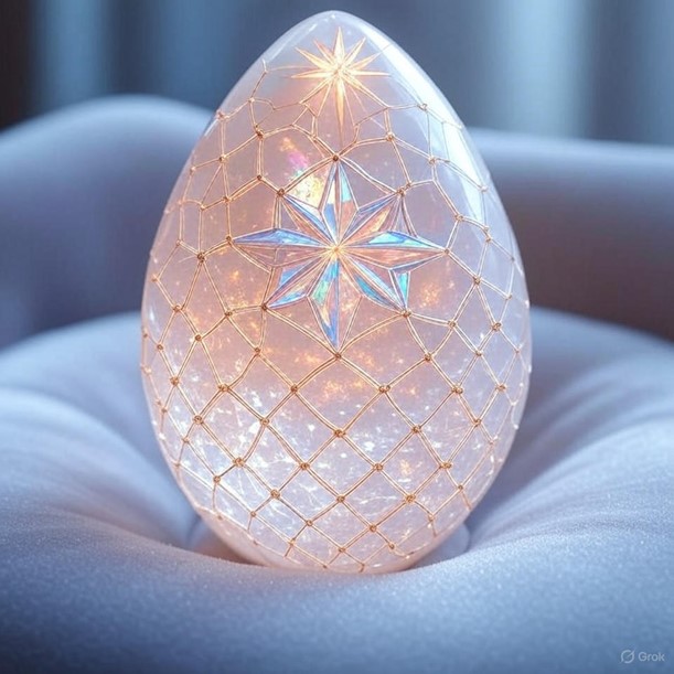 Description: The Pysanka 738 of Crystalweave Prism is a small, hollow egg, about the size of a large quail’s, with a translucent shell that shimmers like polished quartz. Its surface features wax-resist designs of faceted prisms, interlocking crystal lattices, and radiant starbursts, dyed in hues of clear white, soft rose, and pale gold. Delicate veins of iridescent light pulse within the shell, catching and refracting ambient light into tiny rainbows. At its apex, a star-shaped glyph glows with a gentle, crystalline chime when activated. The egg is reinforced with magical flow, giving it a sturdy yet delicate feel, and is typically carried in a cushioned silk pouch or worn as a pendant on a crystal-threaded cord. When held, it feels smooth and cool, like a freshly cut gemstone.