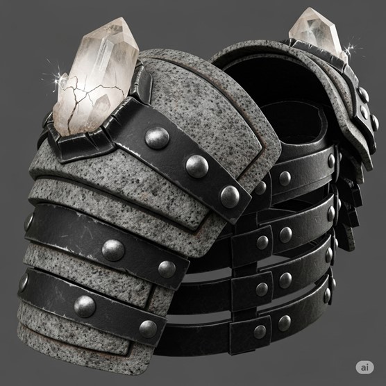Description: The Unmaking Pauldrons are a pair of heavy, brutally functional shoulder guards. They are not crafted from elegant steel, but from thick, layered plates of compressed, magically treated granite, held together by oversized iron rivets and thick leather straps. The top surface of each pauldron is flat and heavily reinforced, designed explicitly as a striking surface. Set into the center of each is a large, milky quartz crystal, intentionally fractured during its forging to better absorb and redirect kinetic energy. The crystals emanate a very faint, low hum, and the entire apparatus is heavy and cumbersome, clearly a tool rather than armor for a swift warrior.