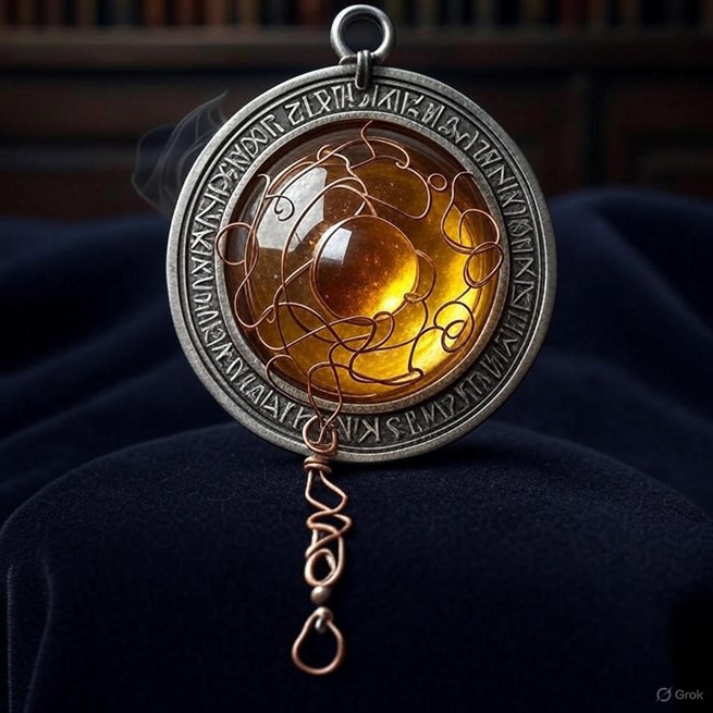 - Description: A slender silver amulet with ancient scripture runes, a glowing amber orb, and copper filaments forming sacred tendrils, crafted by the seer Tamar to reveal divine truths in Saṃsāra’s mystical realm.