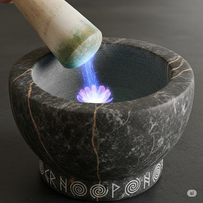- User’s Perspective: This is the heart of the mortar’s magic. As you grind, you feel a direct, intimate connection to the spiritual essence of the plant. It is not an emotion, but a pure state of being. You feel the deep-rooted “stubbornness” of a mountain flower, the “deceitful” nature of a parasitic vine, the “serene” patience of an ancient mushroom. You experience a moment of profound, non-verbal communion that gives you a complete understanding of the ingredient.