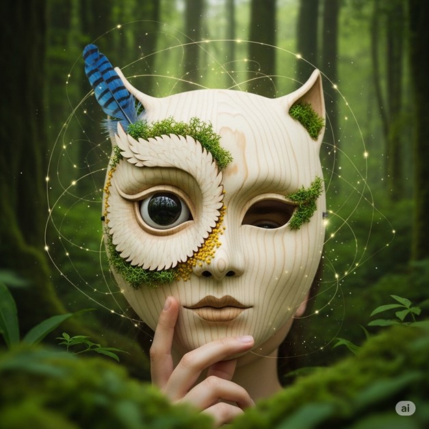 Description A lightweight, half-face mask carved from the pale wood of a balsa tree. Its features are simple and stylized, resembling a serene, wide-eyed forest animal like a lemur or an owl. The mask is not painted or varnished; instead, it is adorned with a living collage of local flora. Tiny, thriving patches of moss grow in the grain, a dusting of yellow pollen clings to the cheeks, and a single, fresh feather from a native bird is tucked behind one ear. These elements are unfixed and seem to change subtly with the health of the surrounding environment.