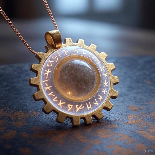 - Description: A brass gear medallion with glowing silvery runes and a central pulsing stone orb, crafted by the Sleih Beggey, designed for faith-driven roleplay.