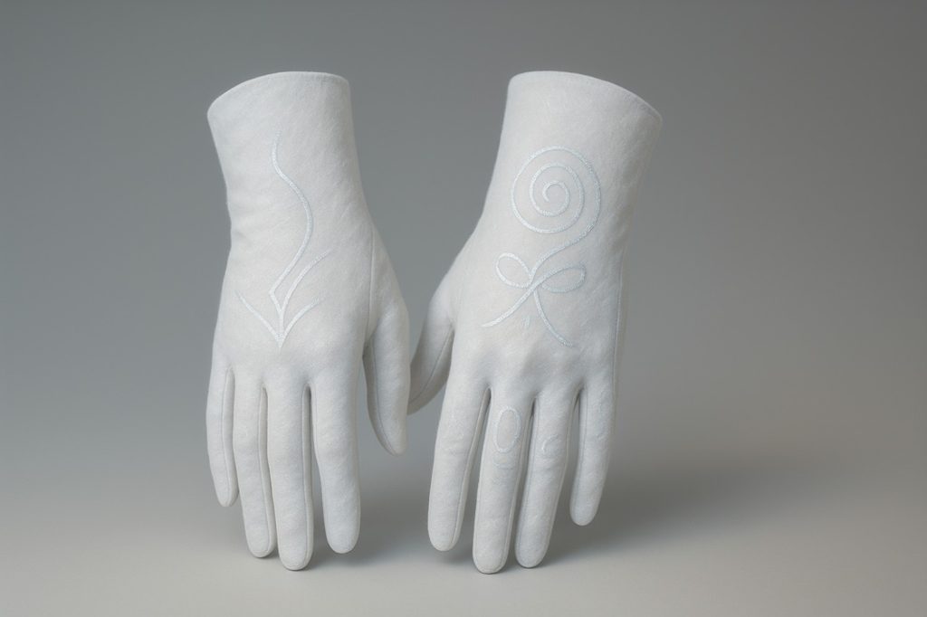 Description: A pair of impeccably crafted, form-fitting gloves that extend just past the wrist. They are made from an exceptionally fine, snow-white tapa cloth that is soft as velvet yet surprisingly durable. The surface of the gloves is decorated with subtle, elegant patterns painted in a shimmering silver ink derived from ground pearls. The symbols are abstract and flowing, representing concepts like a respectful bow (a gracefully curving line), attentive listening (an open, unfolding spiral), and the offering of a gift (two lines meeting in perfect symmetry). The gloves are light as air and fit so perfectly they feel like a second skin.