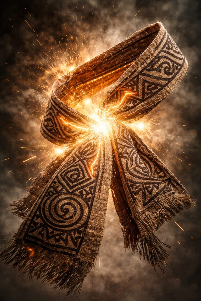 • Sight: The tapa’s symbols snap into sharp clarity, lines tightening and momentarily over-contrasting as if carved into light. A brief flash runs along the patterns, then collapses inward toward a single focal point.