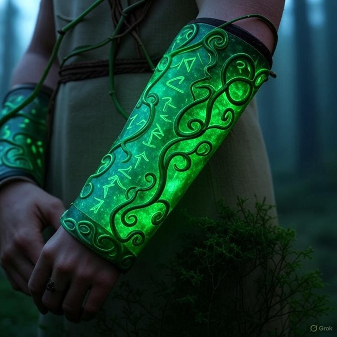 - Description: A jade-carved bracer with glowing forest-green runes and a central mossy emerald pulsing with mist, crafted by shamans of Tikanga and Tapu, designed for fencer roleplay.