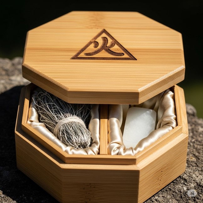 Description This is a small, beautifully crafted tinderbox, octagonal in shape and carved from smooth, pale bamboo. The lid fits perfectly and is etched with the Ba Gua trigram for fire (☲). The box is warm and dry to the touch, regardless of the surrounding weather. Inside, it is divided into two silk-lined compartments. The first contains a small bundle of silvery, fluffy tinder made from the processed fibers of the Sun-Puff Milkweed, a plant known for its affinity for Qi. The second compartment holds a single, palm-sized, perfectly smooth piece of white jade, known as a “striker stone.” The air inside the box smells faintly of dried herbs and warm, clean energy.