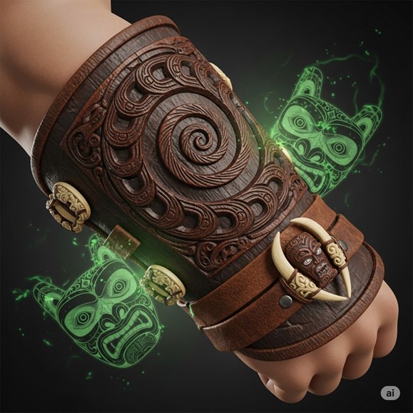 They began carving bracers from the wood of ancient trees that had withstood magical storms. They carved them with the Koru spiral, symbolizing life and protection, and within these spirals, they etched the faces of their most stoic ancestors and totemic guardian animals—the turtle with its unbreakable shell, the armadillo with its armored plates. Through days of ritual chanting and dancing, they called upon these spirits, binding them to the bracers. The result was not a simple piece of armor, but a vessel for a guardian spirit. When called upon, this spirit would manifest a physical barrier, a true “force field” made of solid spiritual energy, to interpose itself between the wearer and harm. These wards are now common protective gear for city guards, explorers, and anyone venturing into harm’s way.