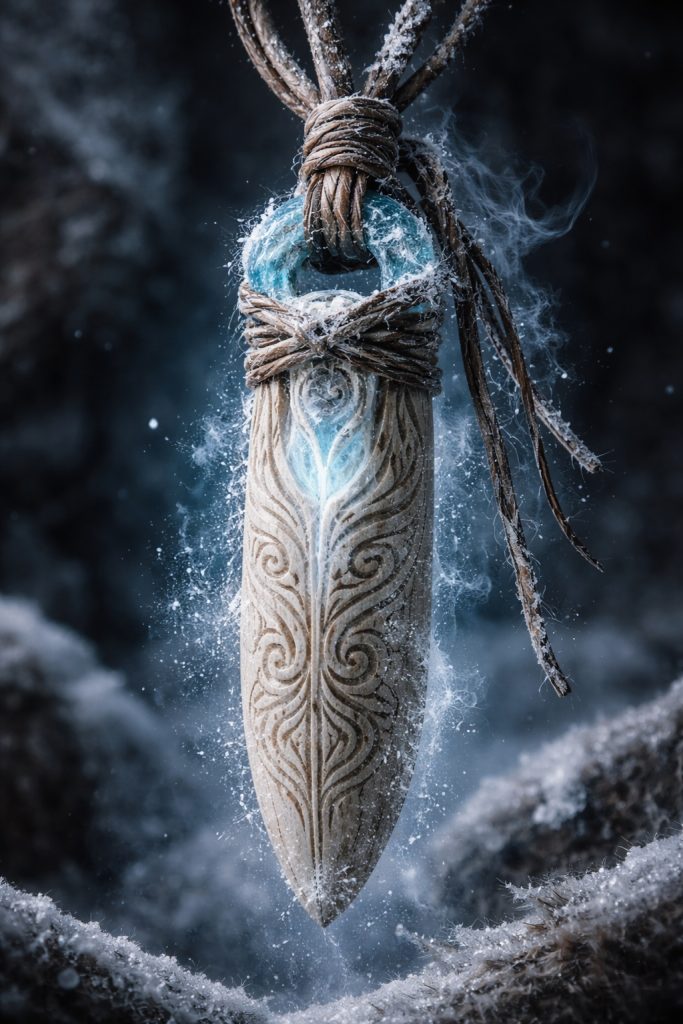 - A palm-length talisman carved from pale bone and rimed with permanently frosted etchings.