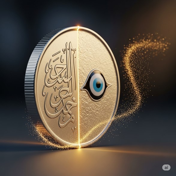 Description The item is a single, heavy silver coin, worn smooth around the edges from years of being handled and rubbed for luck. One face of the coin is polished to a near-mirror shine, with elegant, flowing calligraphy etched into it that spells out a prayer for fortune. The other face is dominated by a small, exquisitely painted Nazar Boncuğu—the iconic blue, white, and black eye—that seems to stare back at the holder, watchful and aware. The coin feels unnaturally warm to the touch and makes a uniquely clear, ringing sound when spun.