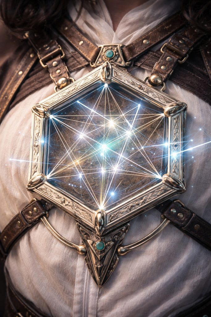 • Appearance: A hexagonal frame of pale alloy suspended over the sternum, holding a rotating lattice of thin crystal rods arranged in shifting geometric patterns. Faint lines of light trace angles between the rods as air flows through them.