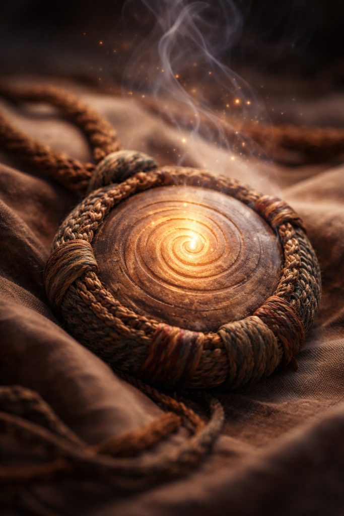 A smooth, palm-sized disk of warm-toned stone bound in braided cloth, often worn at the chest or waist. The surface is worn smooth by touch, etched with shallow circular grooves that resemble tree rings. When held, it feels slightly warm and faintly vibrates in a slow, steady rhythm like a resting heartbeat.